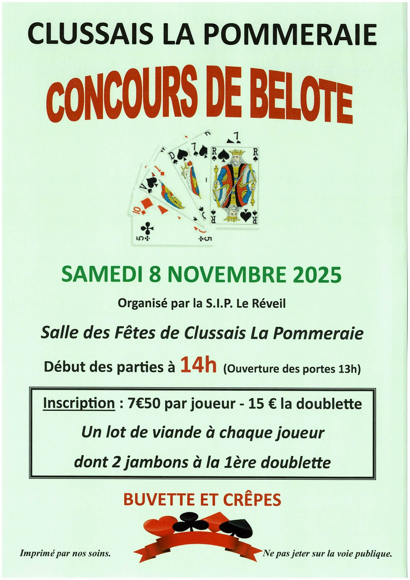 CONCOURS DE BELOTE - - - - - - - Organisé par la SIP- LE REVEIL Salle des fêtes de Clussais La Pommeraie samedi 8 novembre à partir de 14h (ouverture des portes à 13h)