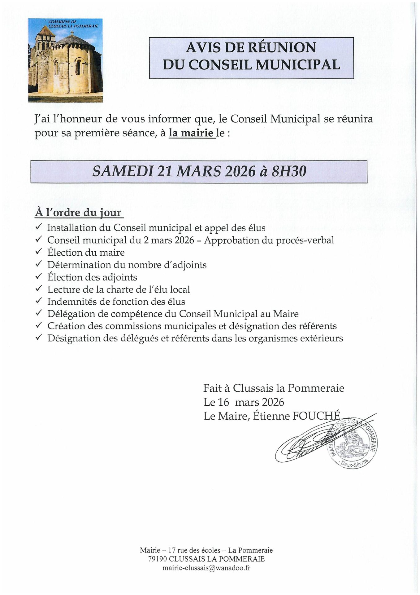 Le Conseil municipal se réunira pour sa première séance Samedi 21 mars 2026 à 8h30